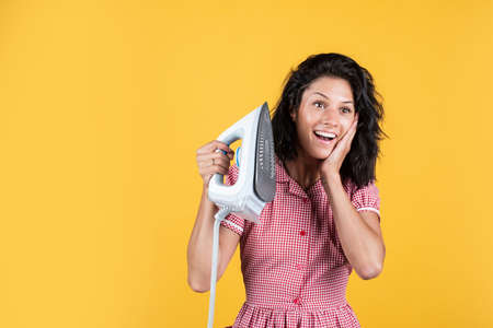 wow. girl in retro dress ironing. housewife has domestic duties. attractive beauty with brunette hair use home appliances. female householding. happy woman presenting steaming iron