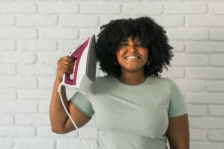 Young satisfied african american housekeeper woman wear mint t-shirt hold in hands on iron on brick wall background. Housework housekeeping concept
