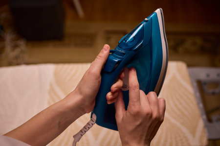 No wrinkled clothing. Close up of woman ironing clothes on ironing board at home