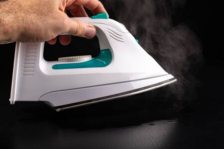 Iron for ironing clothes held in a man's hand. Home accessories to keep clean. Dark background.