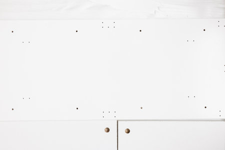 Opened box with furniture assembly drawer parts of and tools on the floor. Self assembling folding table at home concept.