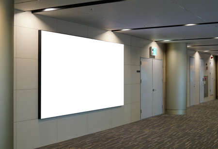 White screen, mockup, science, copyspace, template, isolated, technology concept. Woman looking at blank white display of interactive kiosk at exhibition or museum with futuristic sci-fi interior