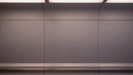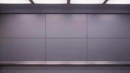 In a sleek and contemporary elevator, smooth metallic walls reflect the overhead lights, creating a sense of space. The atmosphere feels calm and minimal, inviting quiet moments.