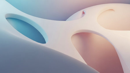 Smooth, flowing abstract organic shapes with soft pastel gradients of pink, blue, and white light creating a serene...