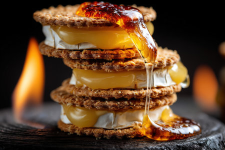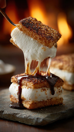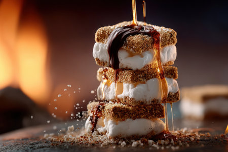Enjoy the delightful sight of stacked s'mores featuring gooey chocolate and melting marshmallow between graham crackers, set against a warm fire backdrop.