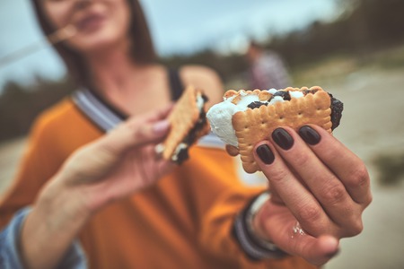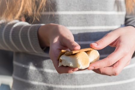 Enjoying a delicious smore treat with chocolate and marshmallow during a cozy evening gathering