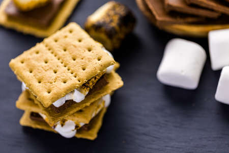 Picnic dessert smores with marshmallows, graham crackers and chocolate