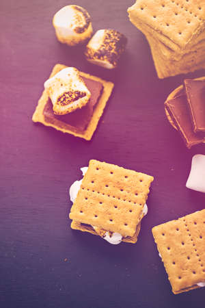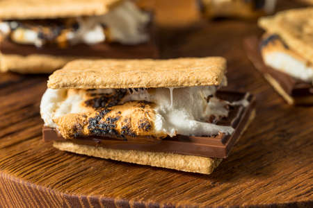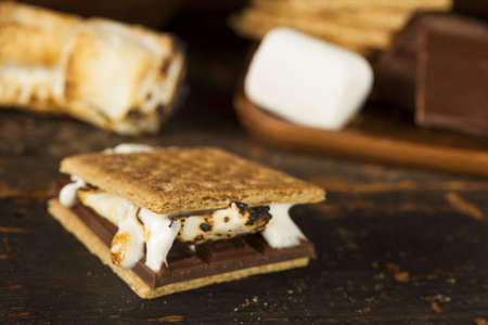 Delicious gooey smores with melted chocolate and toasted marshmallows. This classic camping dessert is on a wooden table before a warm campfire.