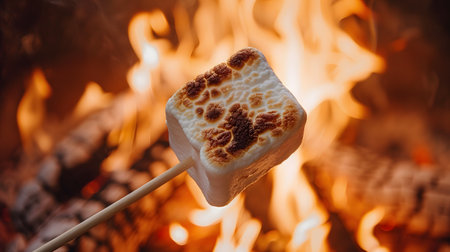 A close-up of a perfectly roasted marshmallow on a stick hovering over a vibrant campfire, capturing the essence of outdoor camaraderie and joyful moments shared with loved ones.