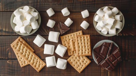 A wooden table featuring a tempting display of food ingredients like chocolate, marshmallows, and crackers, perfect for making delicious indoor smores AIG50