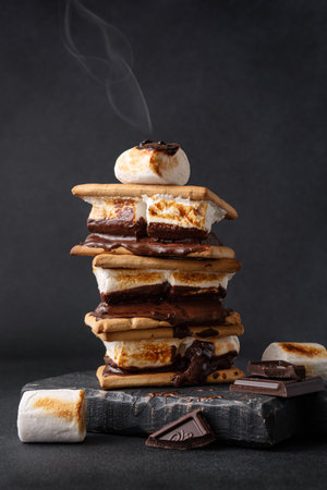 A close-up view of delicious layered dessert treats featuring marshmallows and chocolate between graham crackers, set on a dark slate background, perfect for any occasion.