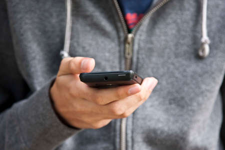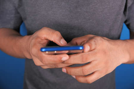 Young man using smartphone. Hand holding mobile texting message contact us.chatting,search internet information. Technology device communication connecting.