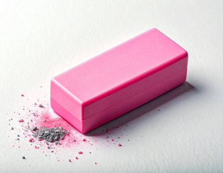 A pink rectangular eraser lies on a white surface, with a small pile of gray and pink powder nearby.