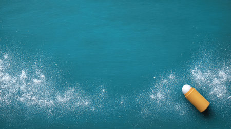 A vivid flat lay image featuring a roll-on bottle with powder scattered around, offering a fresh and clean atmosphere perfect for health and beauty projects or presentations.