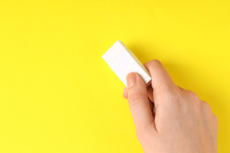 Woman using eraser on yellow background, closeup. Space for text