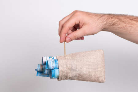 An unrecognizable person holding banknotes of different counties including Israeli Shekel -, finance