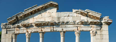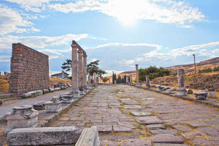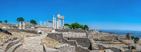 Agora in the Ruins of the Ancient Greek city Pergamon in Turkey. Big size panoramic view on a sunny summer day