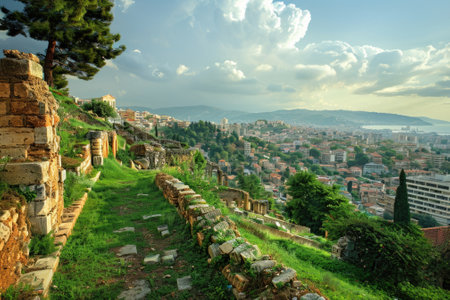 Overlooking the modern city of annaba, the ancient roman ruins blend seamlessly with the lush green landscape. the historic architectural remnants and scattered stone pathways evoke a sense of timelessness under a vibrant, cloud-filled sky.