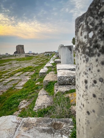 Historical columns of the Agora of Smyrna, aka Agora of Izmir, or Izmir Agorasi, stand tall against a vibrant sunset sky in Izmir, Turkey