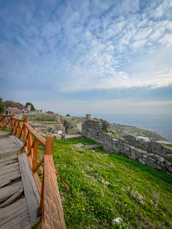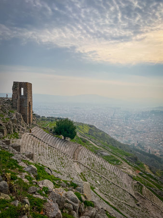 The Acropolis of Pergamon was grandly expanded by Attalid kings like Eumenes II in the 2nd century BC during the Hellenistic era, featuring the steepest ancient theater overlooking the city. This high-resolution image captures sharp details of weathered stone terraces, vivid greens and hazy cityscape under dramatic cloudy skies.