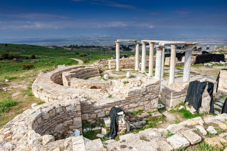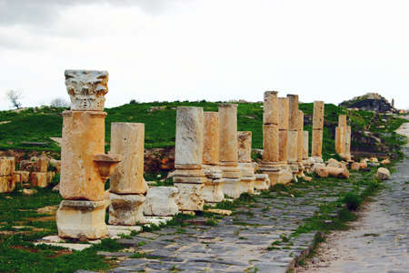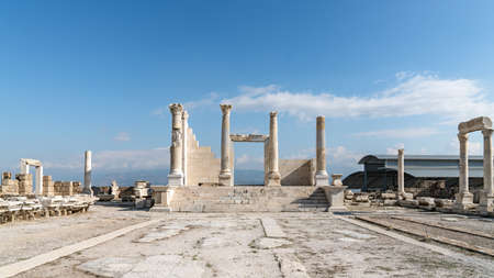 View of historical ancient city of Laodicea in Denizli with high columns on bright blue sky background.