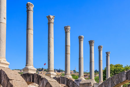 Ancient roman columns against clear blue sky in historical ruins. Authentic ancient Smyrna ruins in Izmir, Turkey.