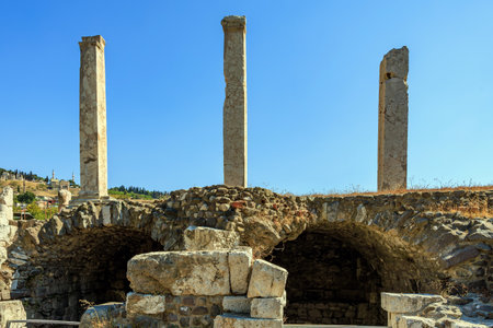 Ancient stone arches and columns. Authentic ancient Smyrna ruins in Izmir, Turkey.