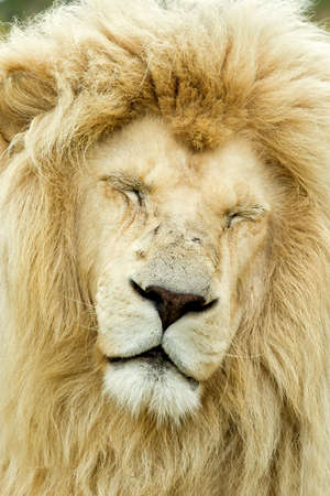 sleeping male white lion in the hot african sun