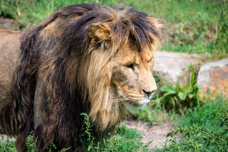 Portrait of a beautiful male lion on green background. Side portrait of a big male African Lion