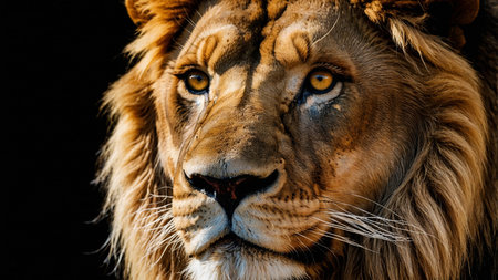 A close-up shot of a lion with a detailed view of its face, fur, and piercing eyes against a dark background, showing the animal's majesty and strength in the animal kingdom, perfectly captured in stunning detail. AI generated image