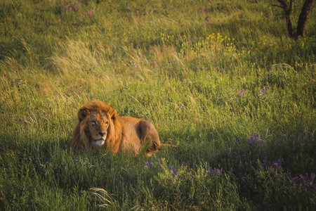 Lion in the savannah at sunset in Masai Mara, Kenya