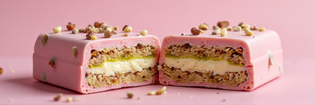 Delicious layered dessert with pink frosting and crunchy toppings. That the image is generated using AI.