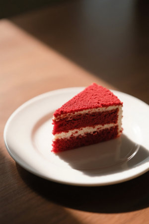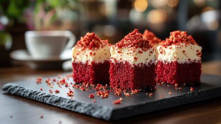 Tempting red velvet cake pieces with cream frosting on a slate board. Perfect for dessert lovers, cafes, or special occasions. Enjoy the sweet indulgence!