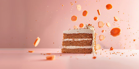 Delicious carrot cake slice with cream cheese frosting on a pastel background