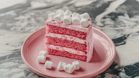 Elegant pink marble cake slice with fluffy marshmallows on a fine china plate, artistic food composition, close-up view