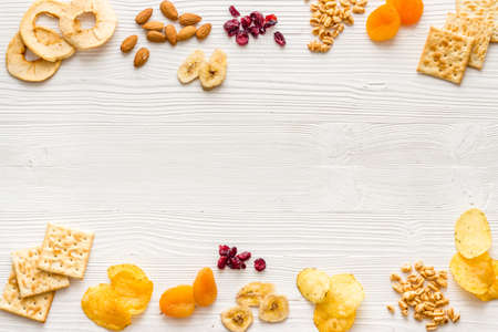 Snacks mix frame top view. Nuts and dried fruits with crackers, copy space