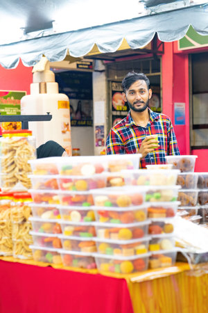 Local businessman is selling Indian assorted sweets or mithai during Deepavali or Diwali festival at the market.