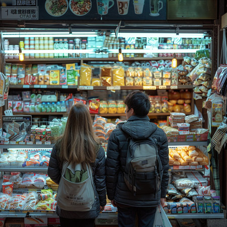 A person in winter attire examines products while standing in a well-stocked convenience store.