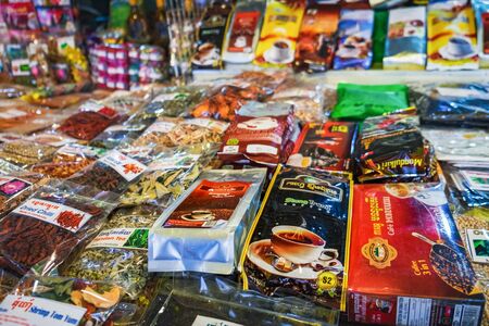 Siem Reap, Cambodia - February 3, 2016: Various sorts of Cambodian herbal dried tea and coffee at night market in Siem Reap, Cambodia