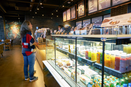 SEOUL, SOUTH KOREA - CIRCA MAY, 2017: display case at Starbucks in Seoul. Starbucks Corporation is an American coffee company and coffeehouse chain.