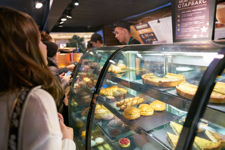 MOSCOW, RUSSIA - CIRCA OCTOBER, 2018: food on display at Starbucks in Moscow.