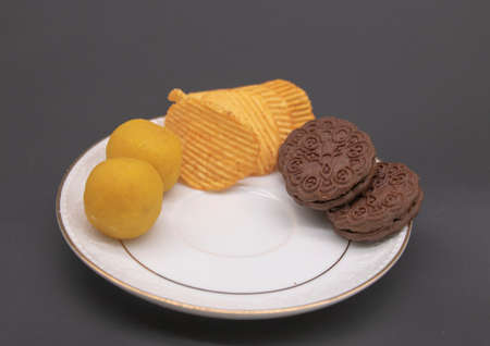 biscuit and chips in a plate over on black background