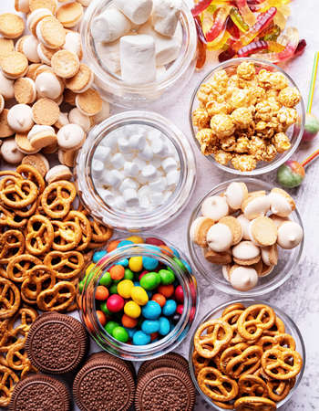 Salty snacks. Pretzels, chips, crackers and candy sweets. Unhealthy products. food bad for figure, skin, heart and teeth. Assortment of fast carbohydrates food.