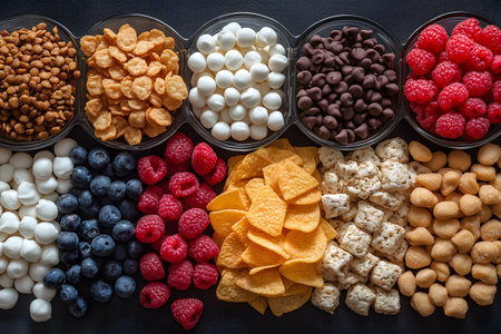 Vibrant, diverse snack collection featuring sweet and savory items, including chocolate chips, popcorn, berries, and nacho chips. ideal for culinary presentation, food blogs, or stock photography. Generative AI