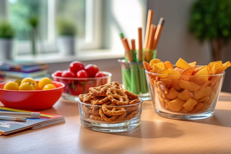 Match day food background, neatly arranged bowls of chips, nuts, nuggets and crackers on a light background, space for text, sports night atmosphere