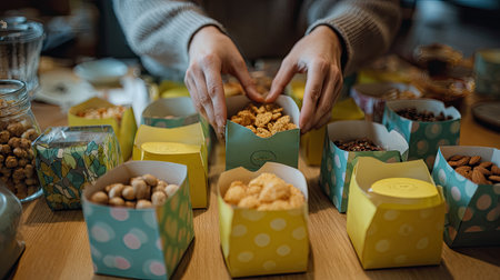 A cozy scene featuring hands organizing vibrant snack boxes on a wooden table, showcasing a delightful assortment of treats perfect for sharing and leisure.