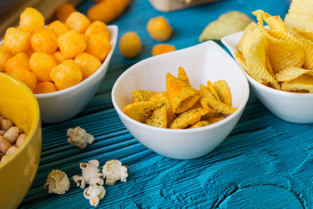 Snacks for TV watching. Chips, nuts, soda, rusks on blue background top view copy space