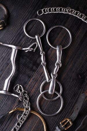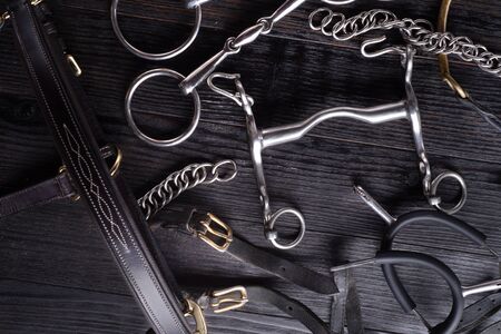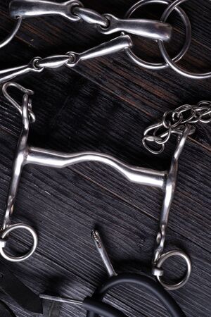 various bits with mouthbridle and spurs on black wooden background. flat lay