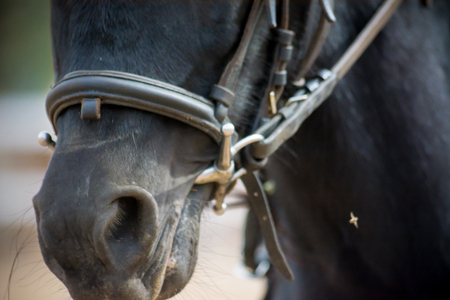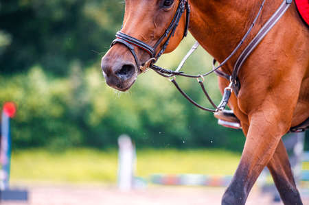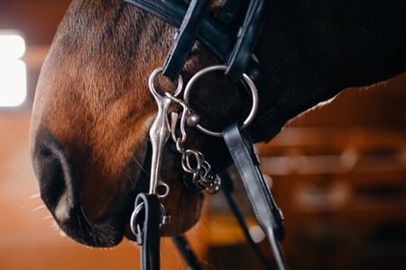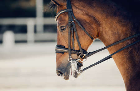 Nose sports brown horse in the bridle. Dressage horse. Equestrian sport.