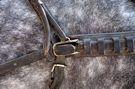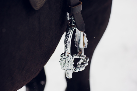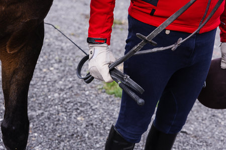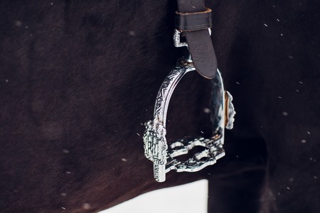 Detail of horse during horse showjumping competition. Close up photo of horse accesories, saddle, bridle, stirrups.